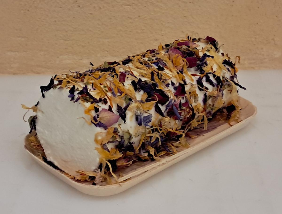 Ingrédients : lait cru entier de vache, ferments lactiques, sel, présure, enrobage : fleurs de mauve, fleurs de bleuet, souci, fleurs de carthame, feuilles de fraises, fleur de roses, trigonnelle bleue.