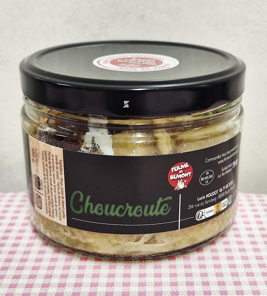 Choucroute au canard : choux, pommes de terre, saucisses de porc fumée, cuisse de canard et lard.