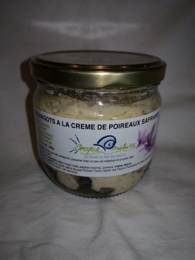 Ingrédients: chair d'escargots calibre moyen ( Hélix Aspersa maxima), poireaux, crème, beurre, court-bouillon ,sel, poivre, safran de paye Richard Thierry Safran des Payoux Vosges.