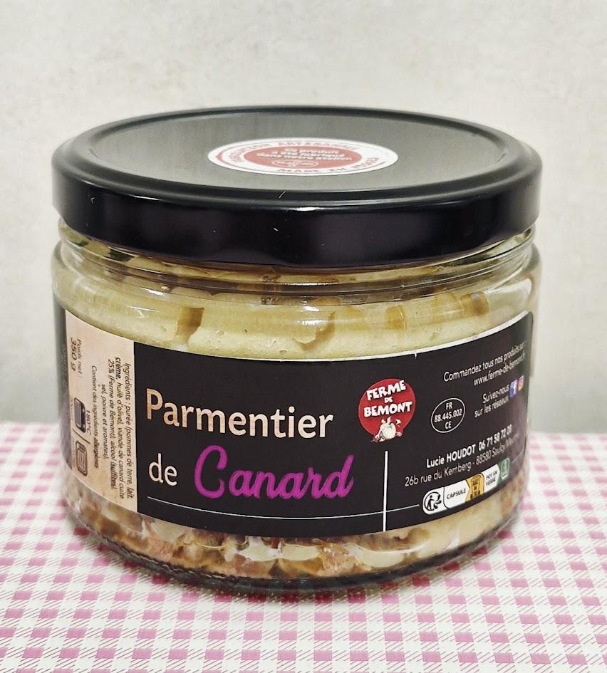Parmentier de canard : purée de pomme de terre, viande de canard.. Produit prêt à consommer, il suffit de le réchauffer 2min30 au micro onde ou 20 min dans un four à 180°C.