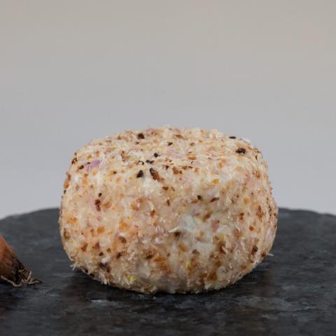 Fromage de chèvre frais au lait cru enrobé d'échalote. Le côté légèrement sucré de l'échalote se marie parfaitement avec le fromage de chèvre frais.
