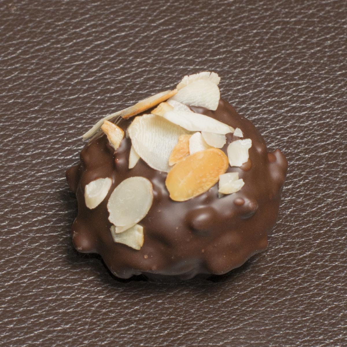 Composition: Beurre de cacao 64% minimum, pâte de cacao, sucre, émulsifiant : lécithine de tournesol, arôme naturel de vanille. Praliné : AMANDE, NOISETTES, huile d’AMANDE raffinée, lécithine de SOJA, arôme vanille,Amandes effilées.