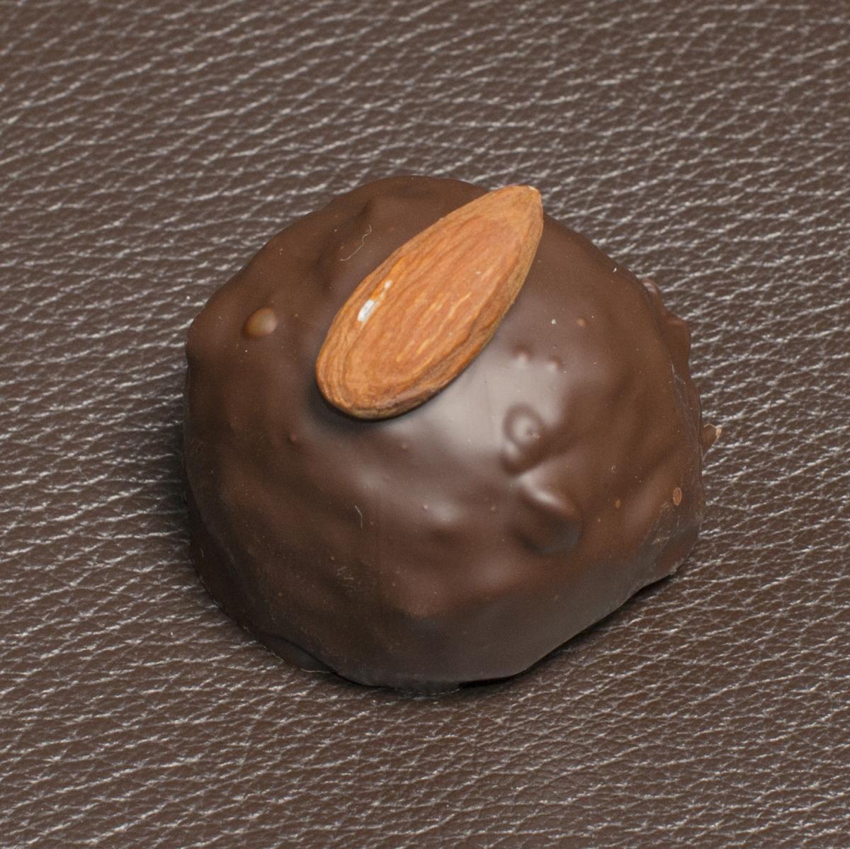 Composition: Beurre de cacao 64% minimum, pâte de cacao, sucre, émulsifiant : lécithine de tournesol, arôme naturel de vanille. Praliné : AMANDE, NOISETTES, huile d’AMANDE raffinée, lécithine de SOJA, arôme vanille.